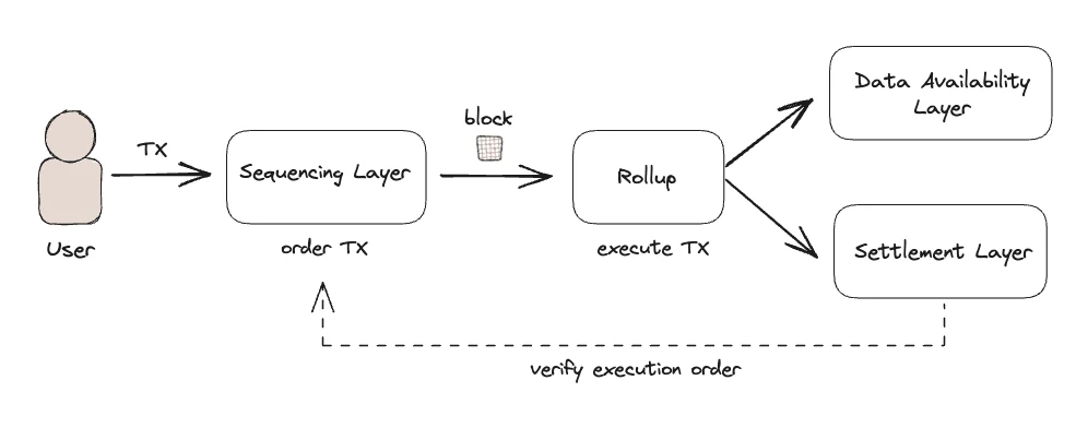 执行层内部还可以进一步分工为 Sequencer 和 Prover,Sequencer 负责计算状态转换,而 Prover 负责生成证明 (尤其是 ZK-Rollup,因为生成证明的计算类型和开销对硬件有一定要求)。