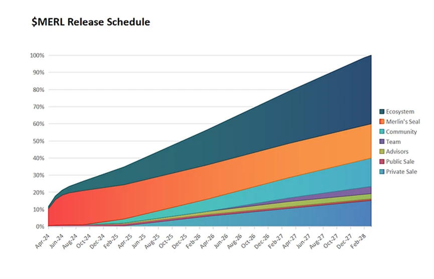 MERL 的总供应量为 2, 1 亿枚,将于 4 年内线性释放。本轮空投的 20% 代币将在第一个月释放 50% ,随后分 6 个月逐步解锁。按目前场外价格 1.74 美元计算,完全稀释市值约为 36.54 亿美元。