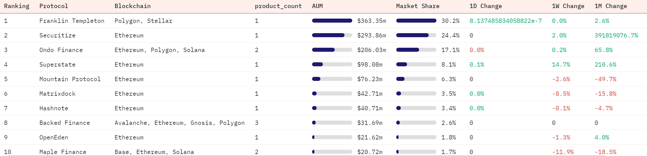 目前根据 21.co 在 Dune 上的数据分析来看,目前代币化国债市场规模已达 11 亿美元,其中 Franklin Templeton、贝莱德联合 Securitize、Ondo Finance 以及 Superstate 占据市场近 80% 份额。以下将逐一介绍。