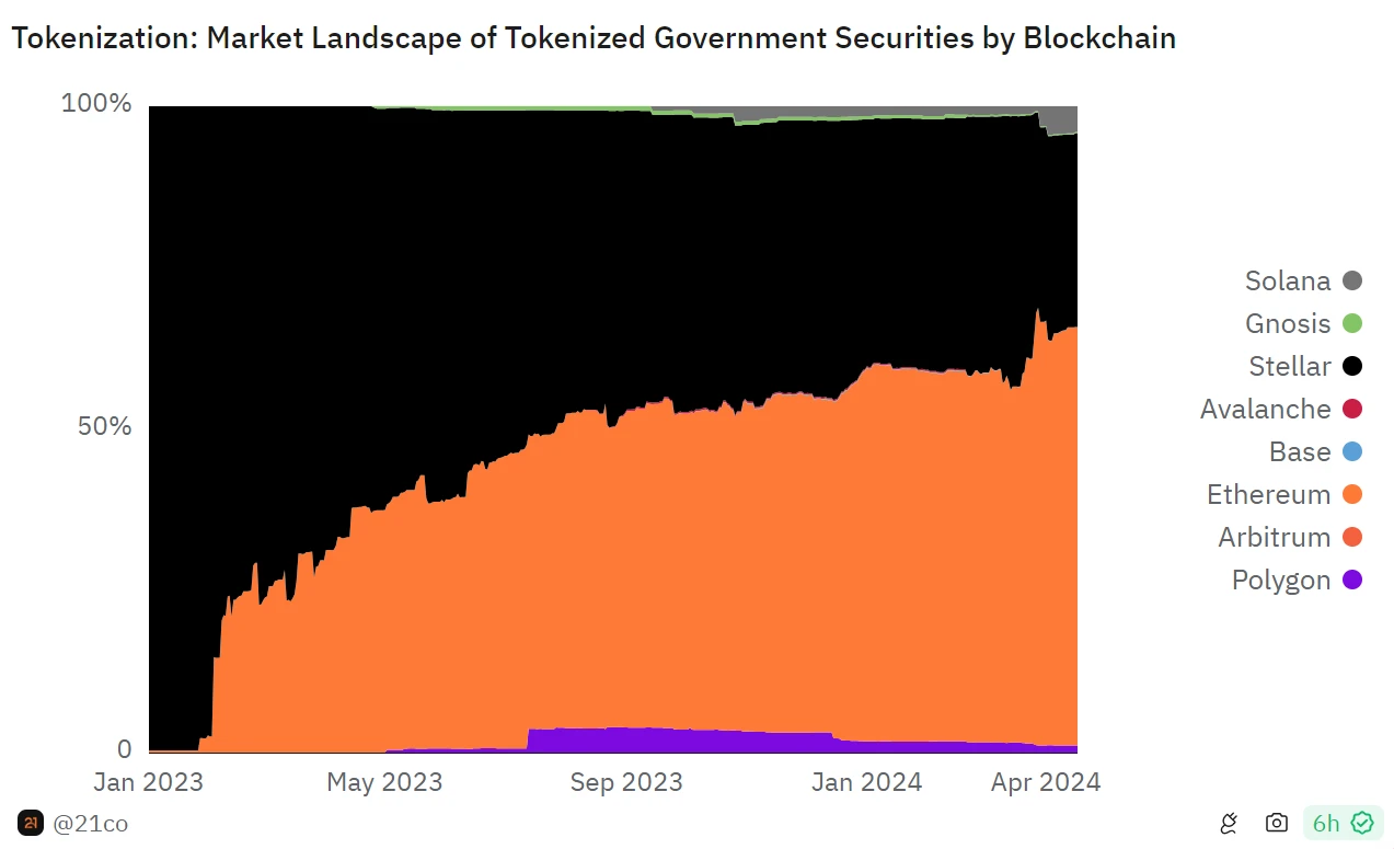 目前根据 21.co 在 Dune 上的数据分析来看,以太坊和 Stellar 占据较高版图,Ondo 将 Solana 作为主战场,但因市场规模来讲,Solana 的版图排列第三。从图中来看,以太坊占据最高的分布原因在于今年贝莱德和 Superstate 推出的基金,Stellar 是在于 Franklin Templeton 多年的积累,但目前链上推出的 RWA 项目多聚焦在 Solana 上,后续 Solana 或将持续扩大。