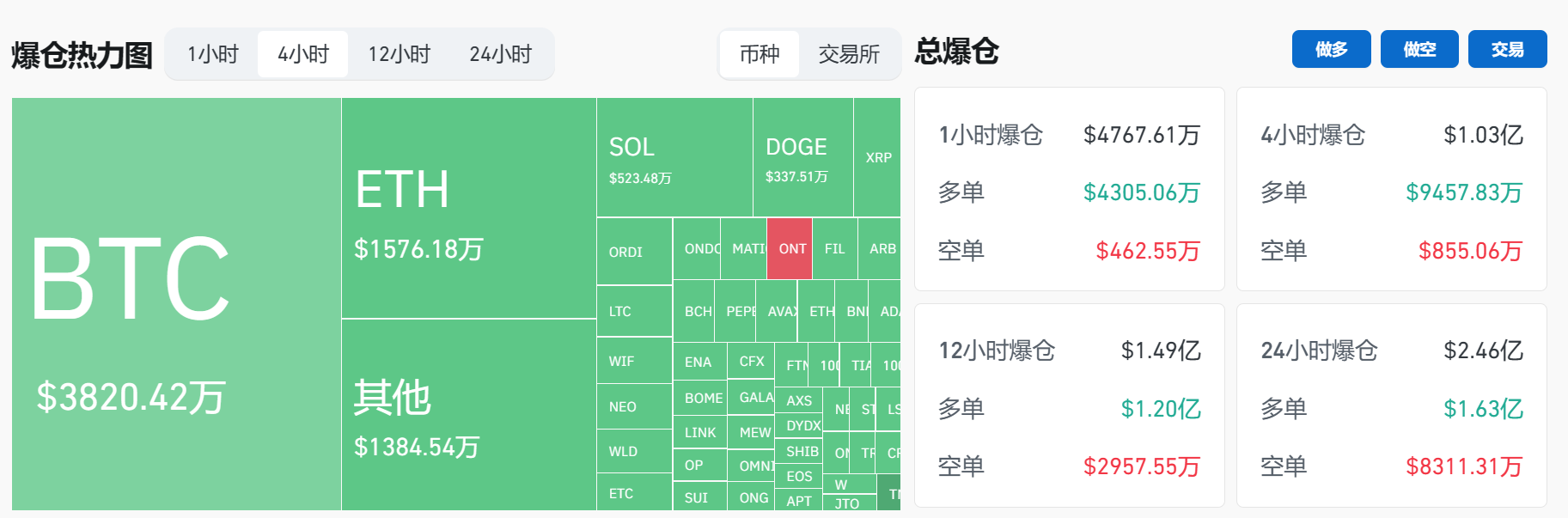 而 Coinglass 数据显示,过去 4 小时全网爆仓逾 1 亿美元,其中多单爆仓 9457 万美元,山寨市场更是一片哀嚎,近半个月来腰斩比比皆是。