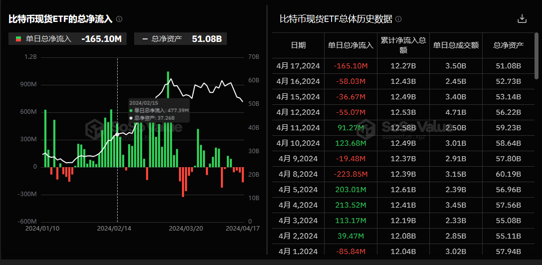 此外,有个信号值得关注——据 SoSoValue 数据, 比特币现货 ETF 4 月 18 日总净流出 2315 万美元,已连续 5 日净流出。