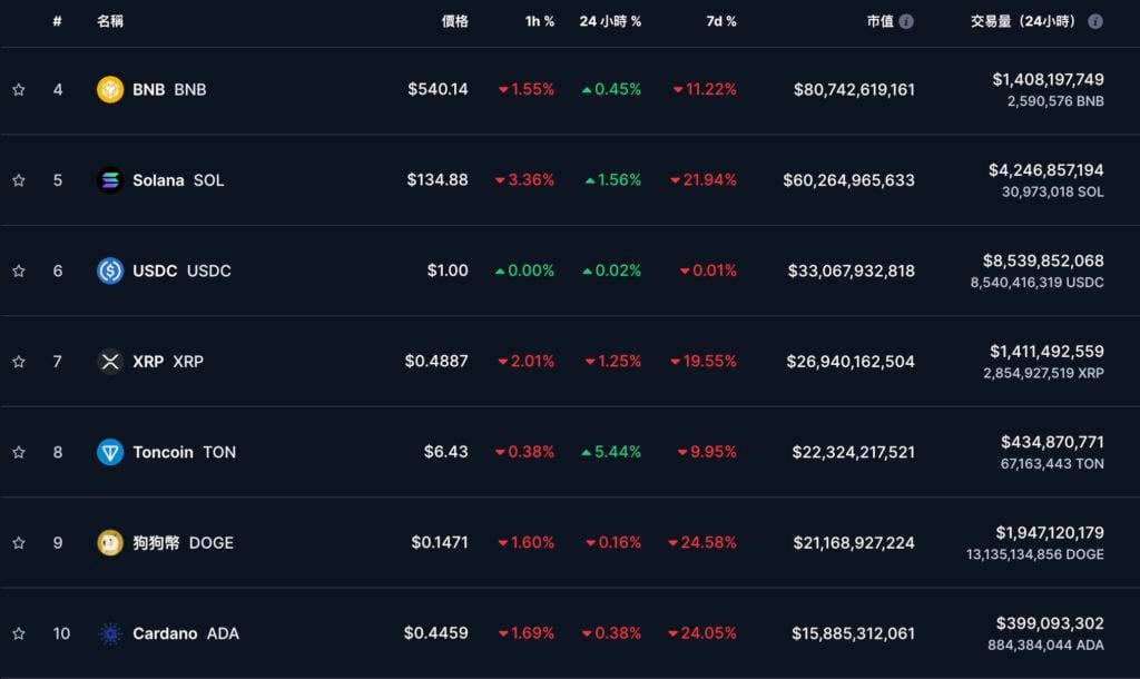 CoinMarkeCap 数据 显示 ,其他前十大代币近 24 小时涨跌不一。跌幅最大的是 TON 上涨了 5.44 %、其次是 SOL 上涨 1.56%,站回 130 美元之上;跌幅最大的是 XRP,下挫 1.25%。