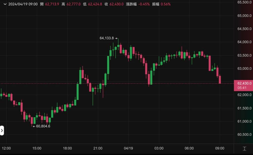 而在加密货币市场方面,比特币价格从昨日午间𫔭始震盪走高,深夜最高一度触及 64,133 美元。不过后续卖压涌现,撰稿当下报 62,430 美元、近 24 小时上涨幅度缩窄至 1.07%。