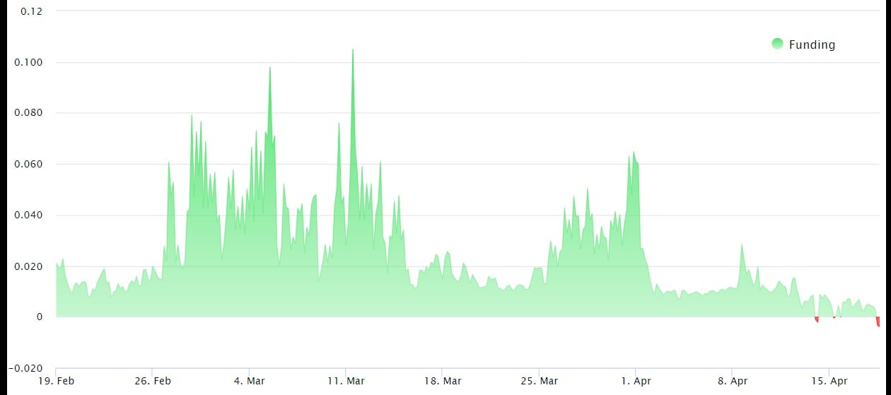 数据 指出 ,BTC 资金费率在 4 月 15 日和 4 月 18 日显著转为负值,创下六个月多来的最低水平,这表明投资者看涨兴趣下降,而在 4 月 12 日至 4 月 18 日期间比特币价格跌幅高达 13.5% 。