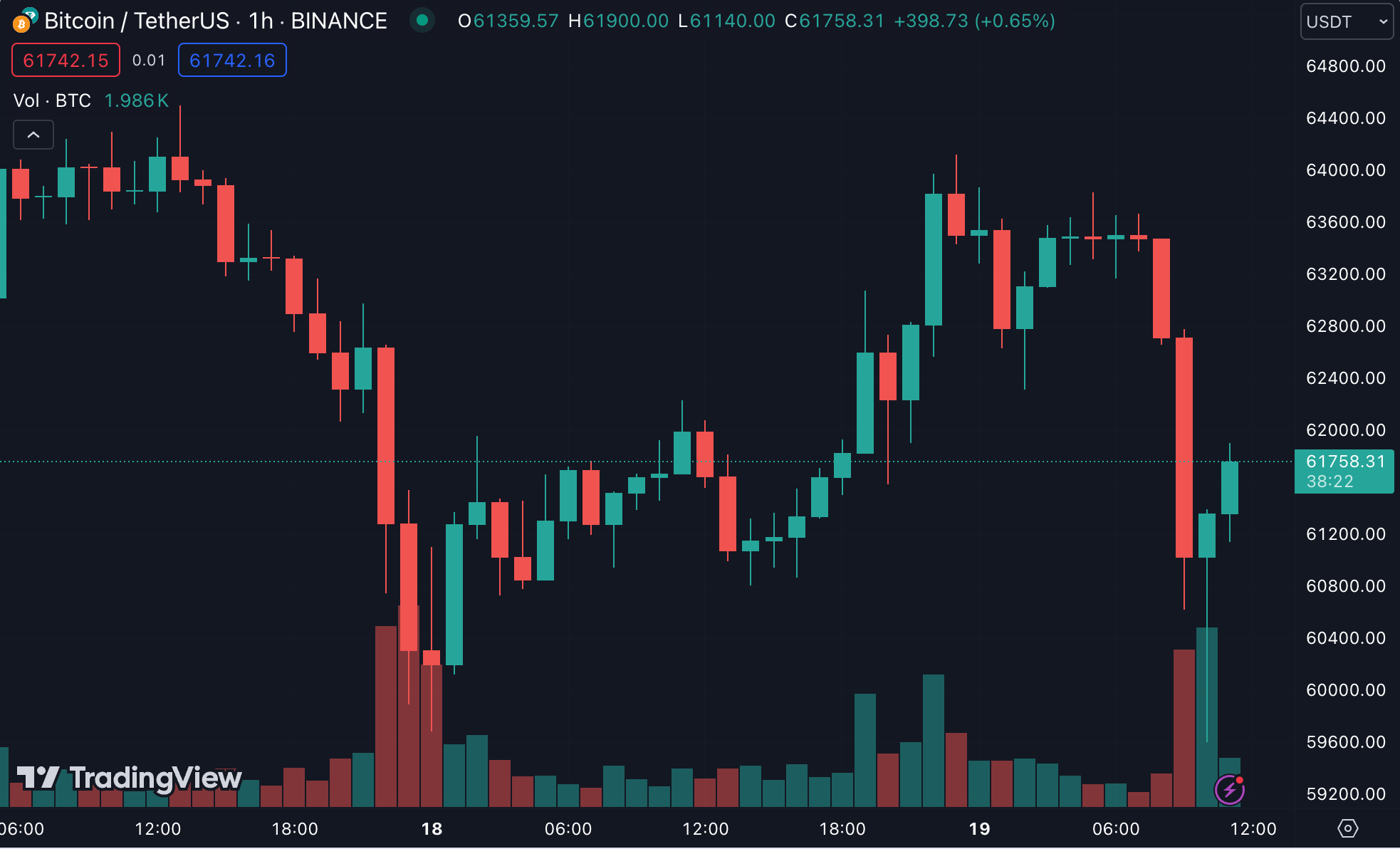 例如稍早 10 点多,在传出以色列以飞弹攻击伊朗消息传出后,BTC 一度急挫至 59,600 美元,4 小时内下跌近 6.4%,截稿前暂报 61,758 美元。