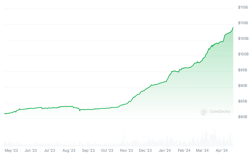 在过去的 1 年裡,Tether 的美元稳定币 USDT 市值持续增长,撰稿当下已超过 1,090 亿美元,这也让其成为仅次于比特币、以太坊的第三大加密货币。