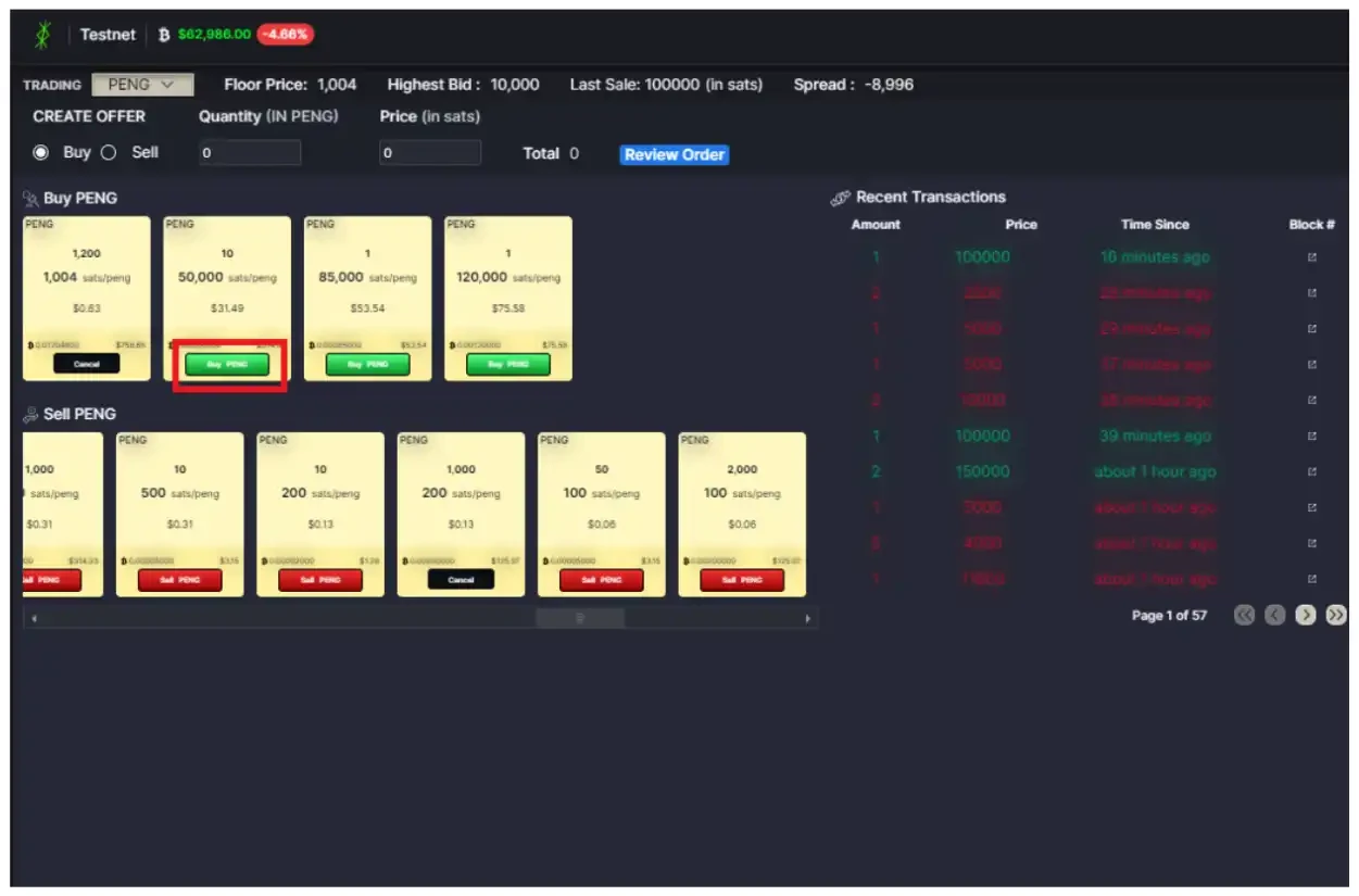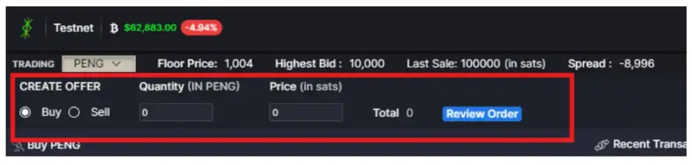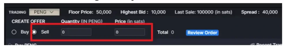 输入每个代币的数量和 sats 价格。检查订单并确认(注意您只能为每个代币创建一个竞价,这是由于 utxo 的限制),一旦完成,列表将以以下方式显示。