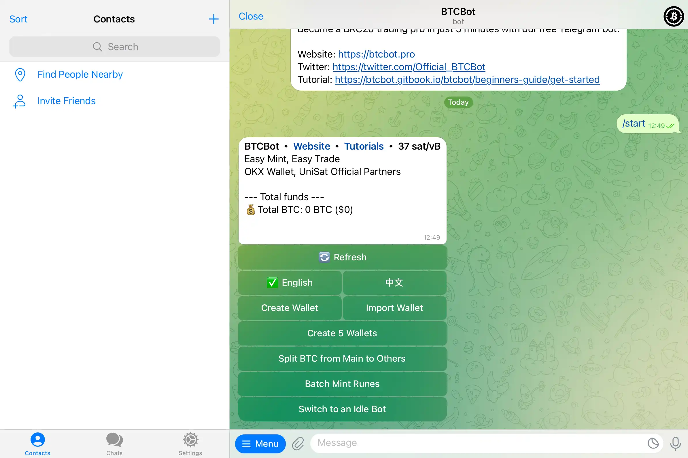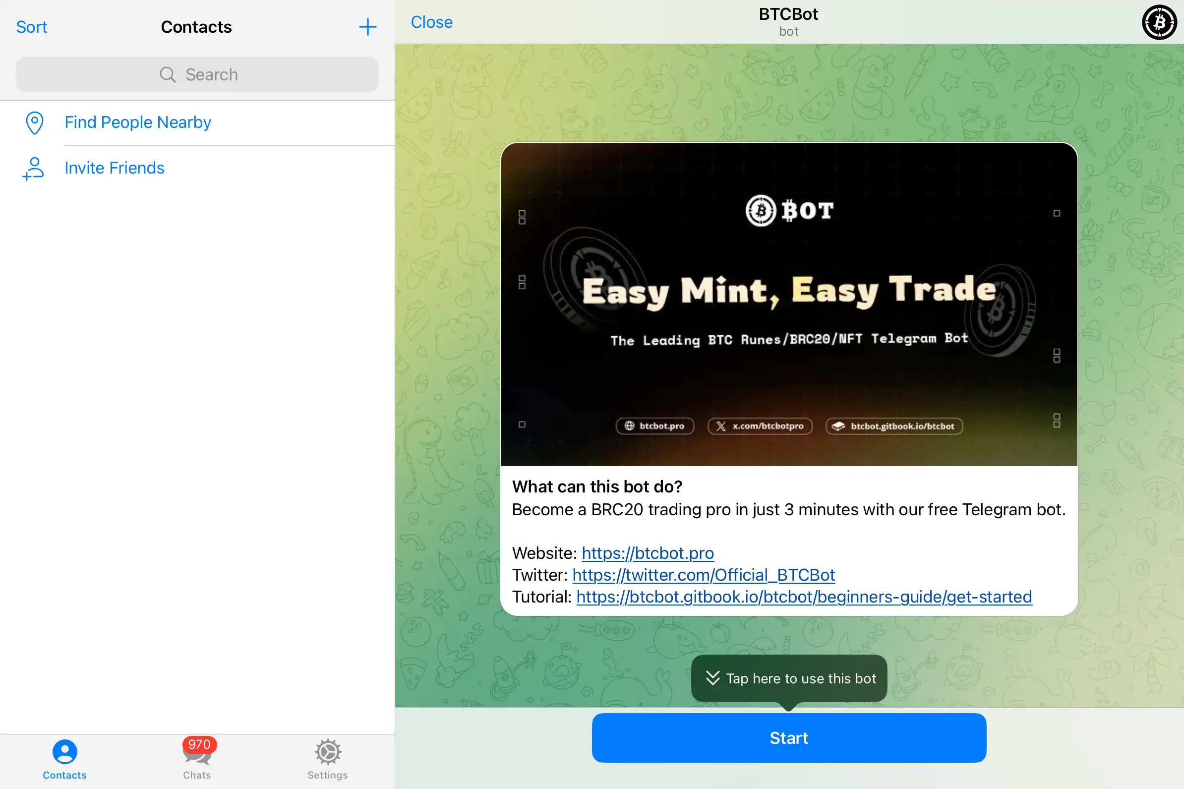 1. 在 Telegram 中打开 BTCBot ,点击「Start」(开始)进入机器人聊天窗口。