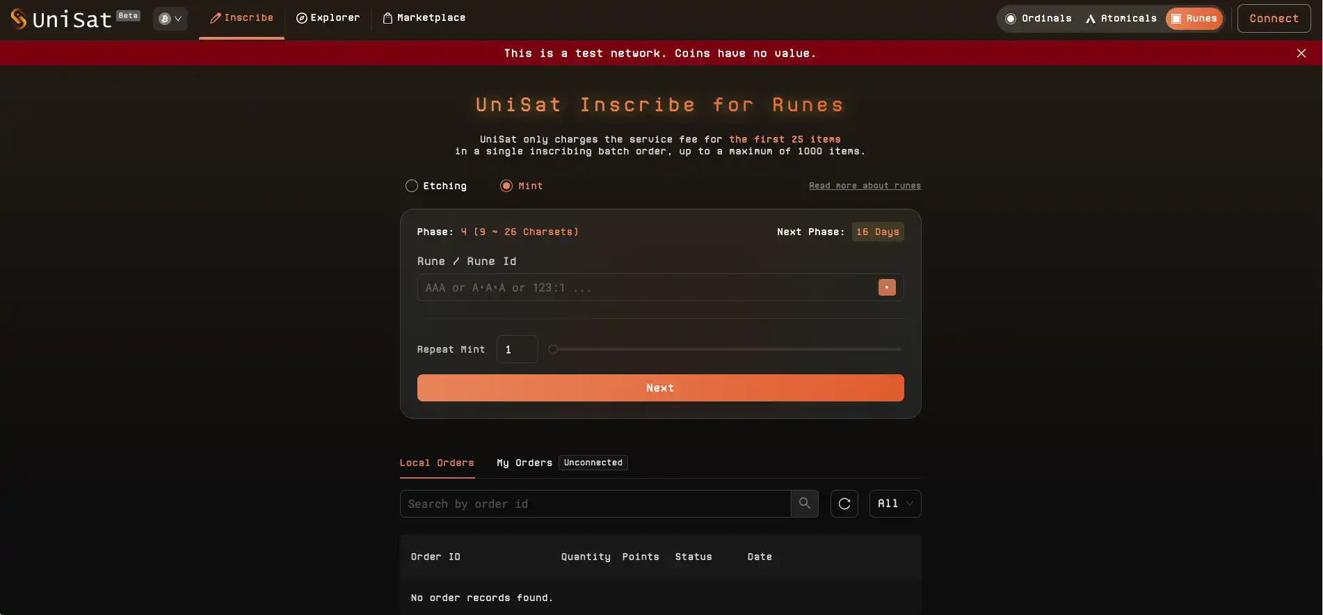 3. 打开 unisat 测试网 ,在「Inscribe」(铭刻)页面切换至「Mint」(铸造)选项。在「Rune / Rune Id」列内输入想要铸造的 ruen 名字,在「Repeat Mint」列内手动输入或拖动滑轨确定要铸造的 rune 数量。确定好后点解「Next」(下一步)。