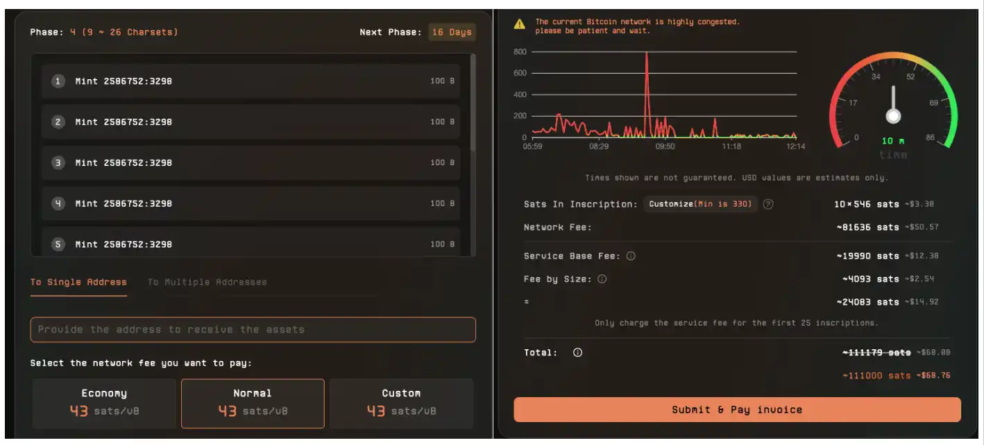 4. 在「To Single Address」(发送单一地址)内输入要接受符文的测试网地址,根据需求选择不同的铸造速度。值得注意的是,Custom 可以在「Sats In Inscription」(铭刻费)列表自定义调整 gas。最后点击「Submit Pay invoice」(提交并支付)即可提交订单。