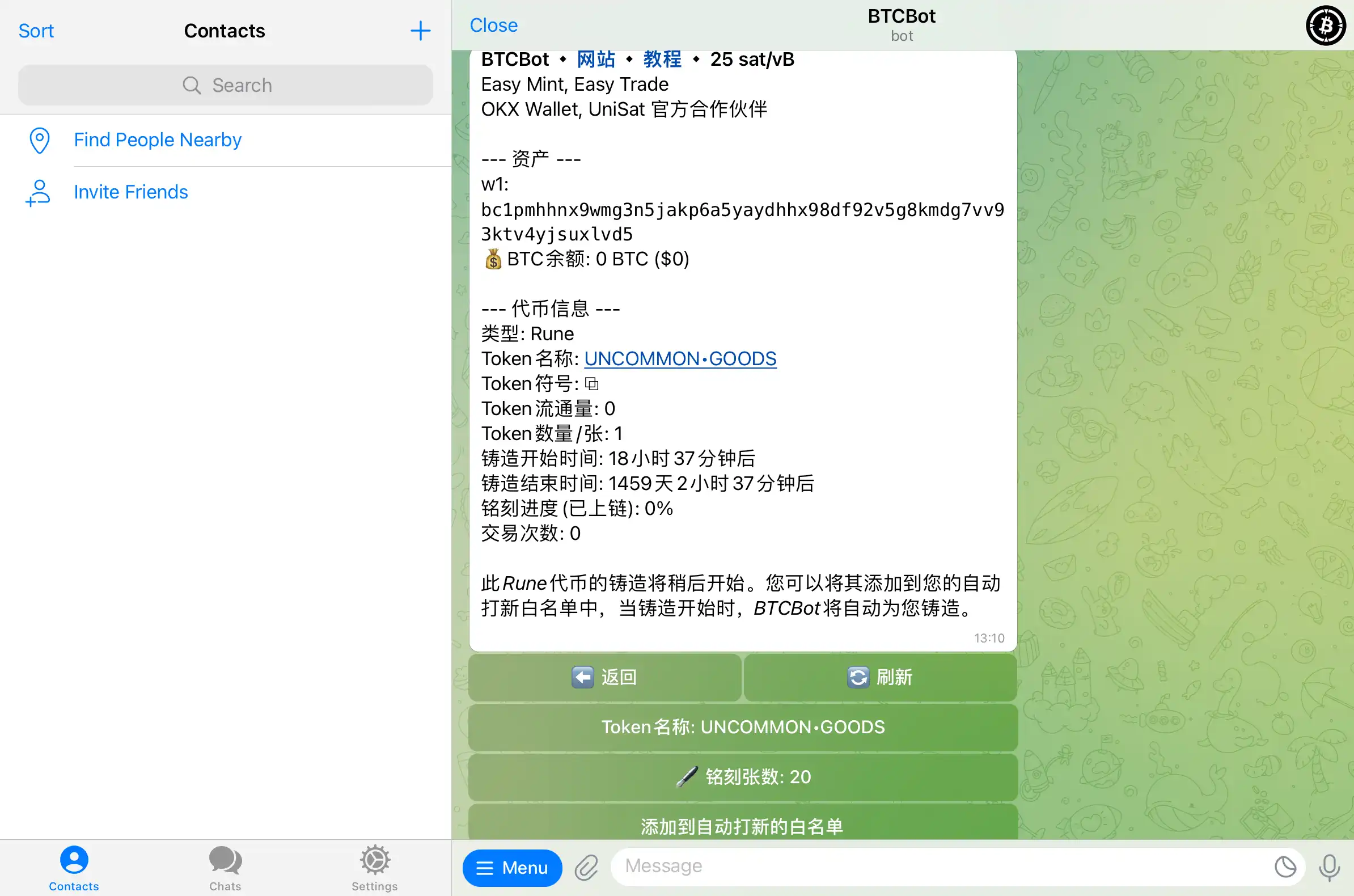4. 选择 bot 的「Batch Mint Runes」(批量铸造 Runes),输入希望铸造的 Runes 名称。这里以 UNCOMMON•GOODS 为例,bot 会告知 UNCOMMON•GOODS 的基本信息。若确定要铸造,则点击「添加到自动打新的白名单」,当铸造开始后,bot 将自动铸造。铭刻张数也可通过直接与 bot 对话设定。