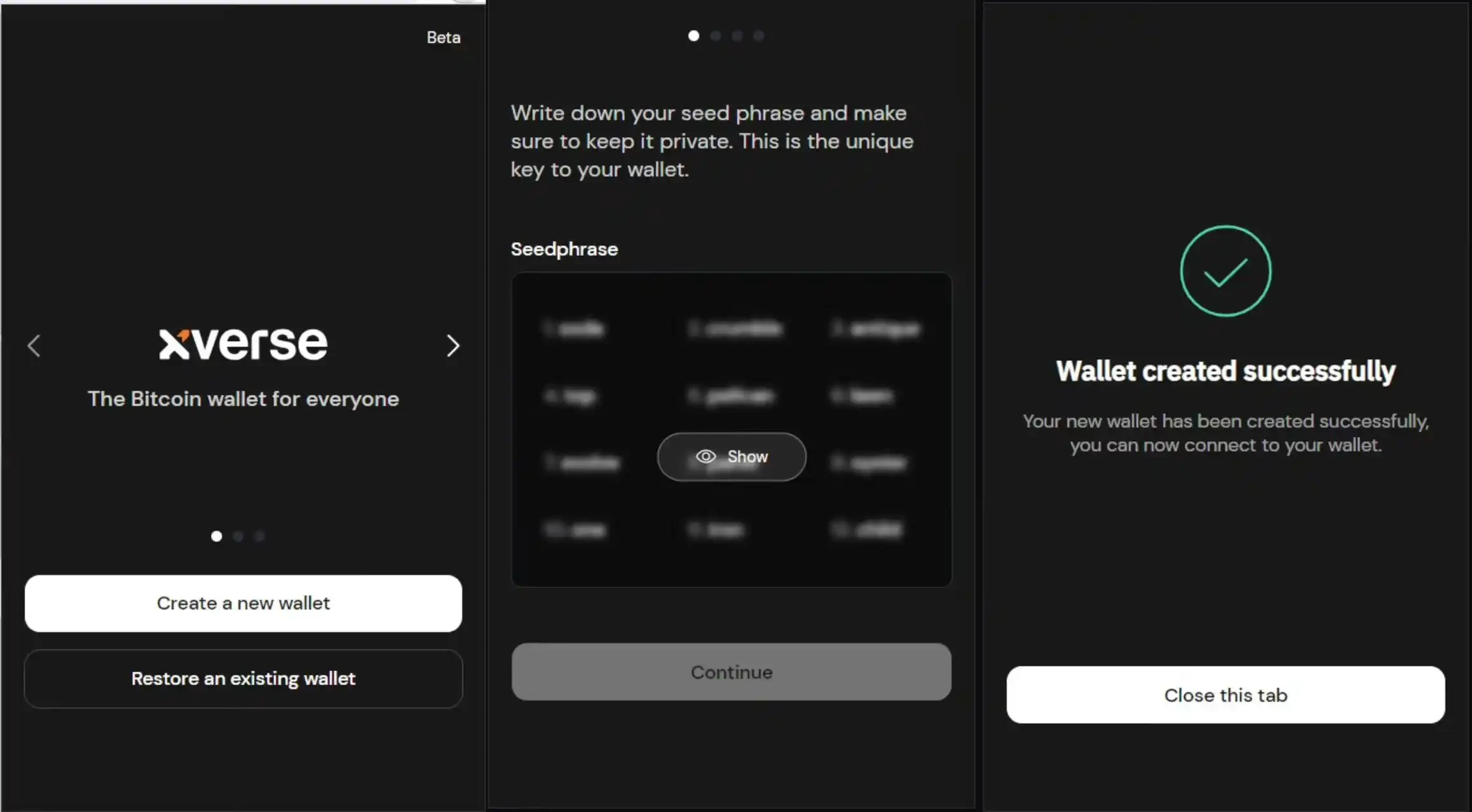 1. 打开 Xverse 官网 ,选择 chrome 浏览器下载插件并安装。在 chrome 浏览器扩展程序中,打开 Xverse 插件。新用户在此界面选择「Create a new wallet」(创建新钱包)。点击后会弹出 12 位助记词,备份助记词并设置密码,完成钱包创建。