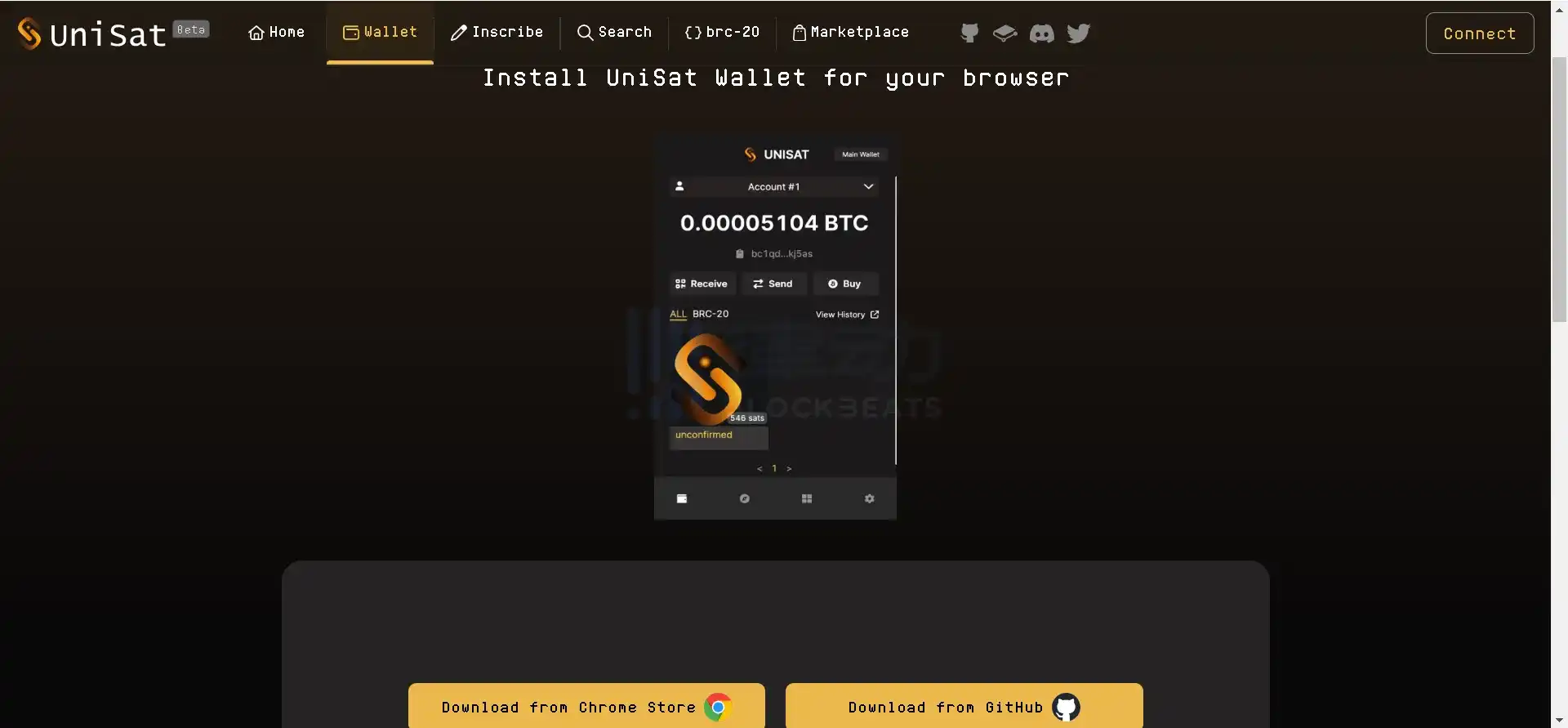 1. 打开 Unisat 官网 ,选择 chrome 浏览器下载插件并安装。