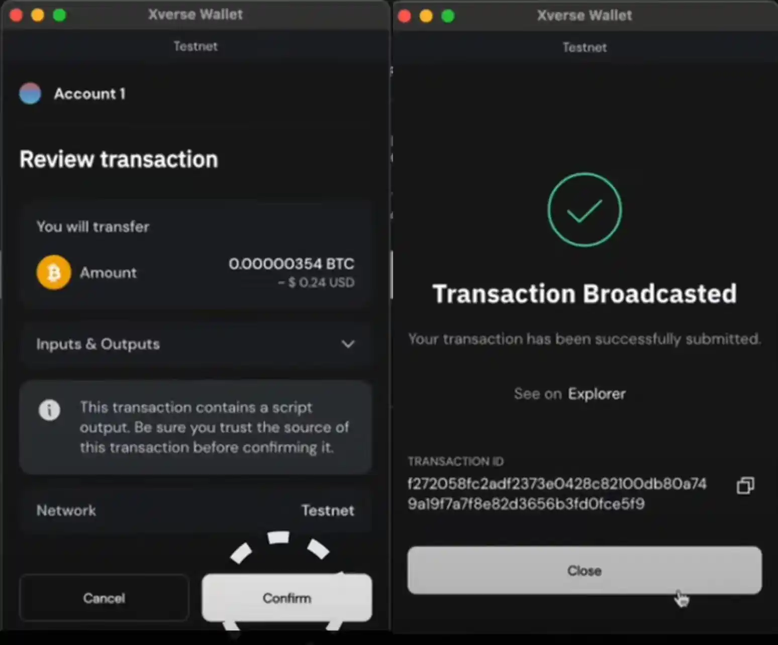 需要注意的是,Xverse 钱包主网有 2 个地址,「 3 」开头的 BTC 地址和「bc 1 」开头的资产存放地址(Ordinals、Runes、稀有聪等,测试网有 1 个地址,是「 2 」开头的)。如果要在主网进行交互,则把准备的好的 BTC 转入「 3 」开头的 BTC 地址,不要转入「bc 1 」开头的资产地址。