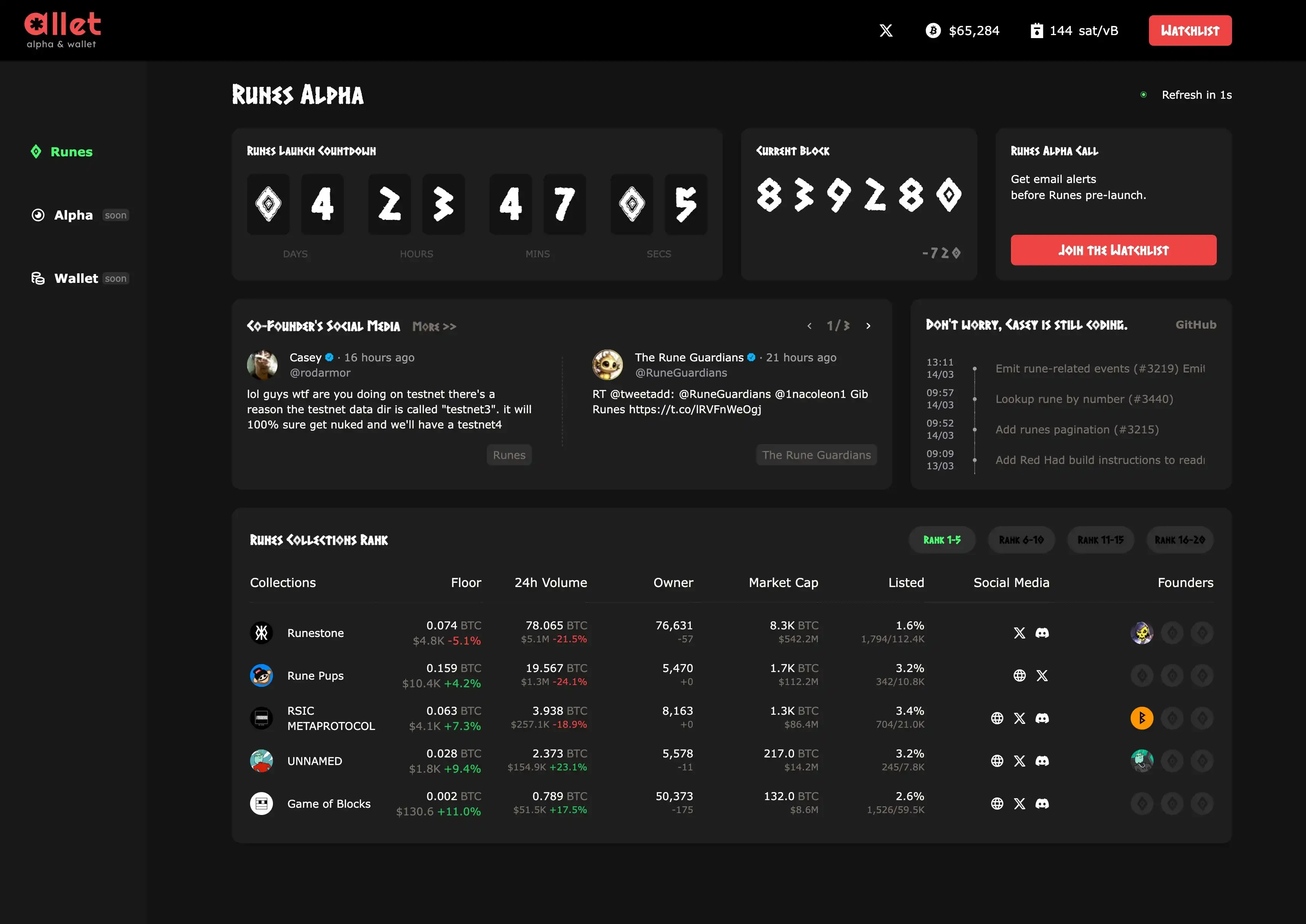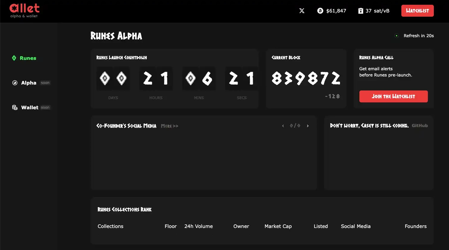 目前 Allet 还有很多工具没有上线,但据官方显示,Allet 之后还会更新的一些生态相关的重要 KOL 和项目团队社交媒体账号,保持消息灵通。此外还会收到详细的更新地板上的价格和 24 小时交易量的所有文有关的收藏品,例如 RSIC 和符石。