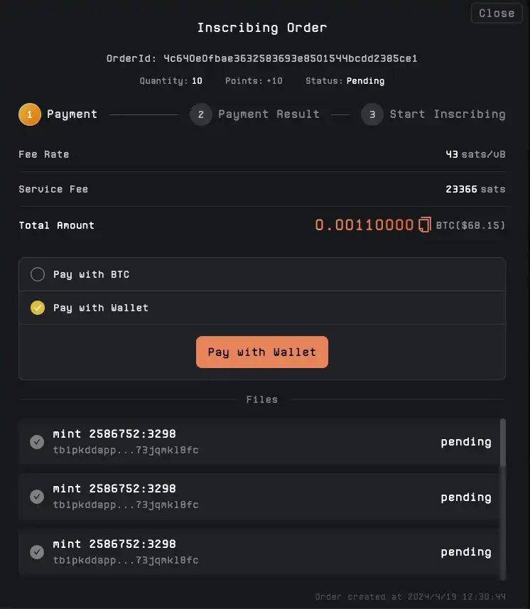 5. 最后选择一种支付方式签名支付即可。若先泽钱包支付,需确保钱包里有余额,否则支付会失败。支付成功后,耐心等待区块确认即可。可以在 mempool 中查看进度,铸造完成后会在钱包里显示。