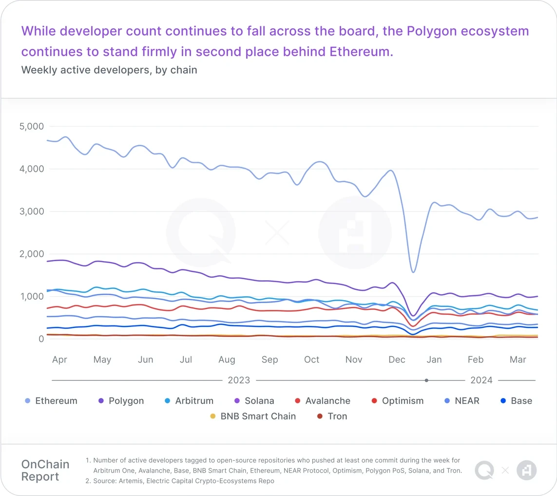 此外,Polygon 正在使用其链开发套件 (CDK)验证配置从侧链过渡到L2网络。虽然 Polygon 的活跃开发者的数量不断下降,但仍然保持着第二的位置。