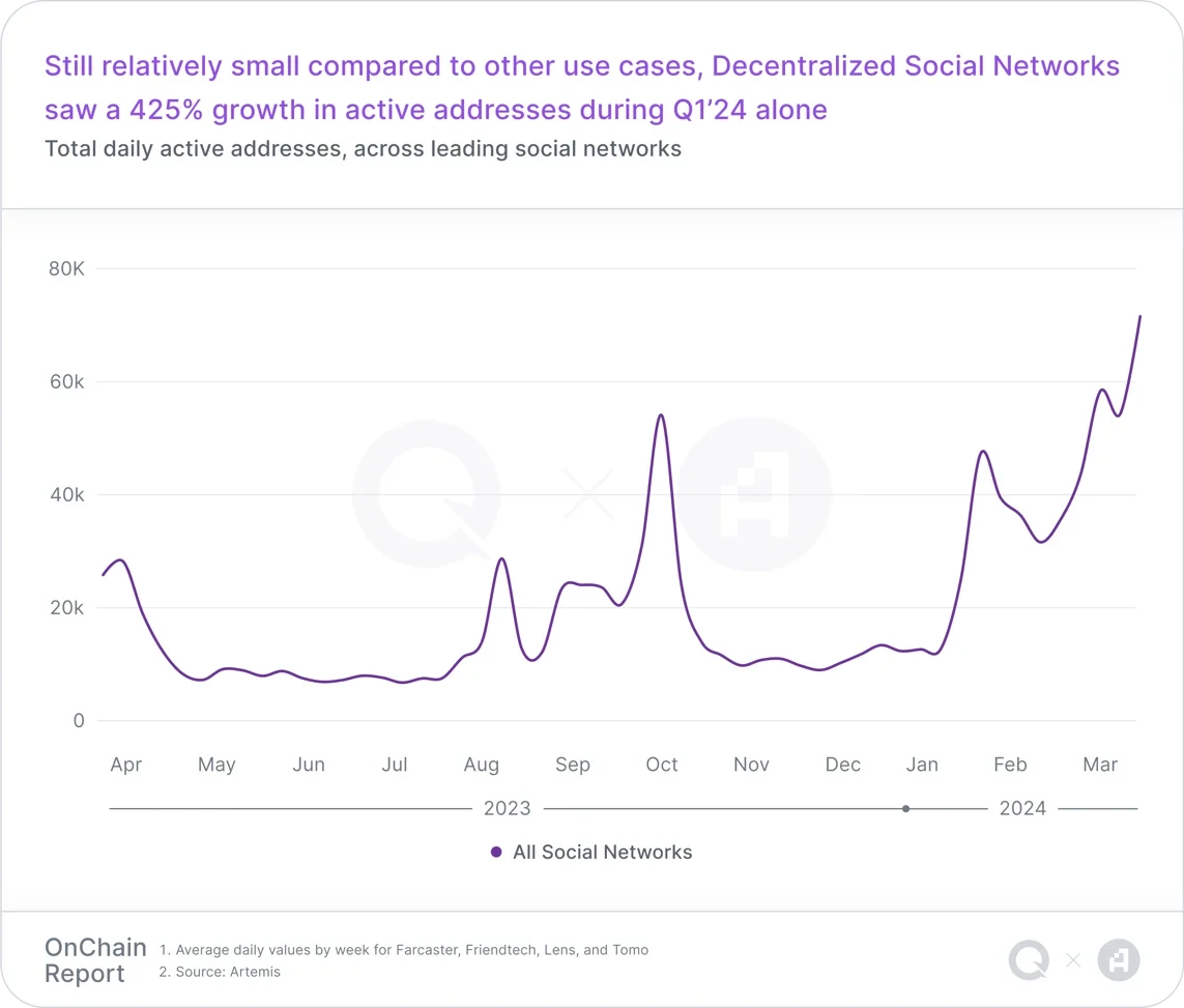 去中心化社交网络在 24 年第一季度经历了快速增长,用户活动增加了 425% ,表明市场对基于区块链的社交平台的兴趣日益浓厚,主流平台包括 Farcaster、Lens、friend.tech 和 Tomo。