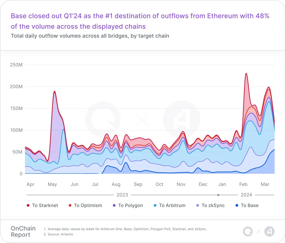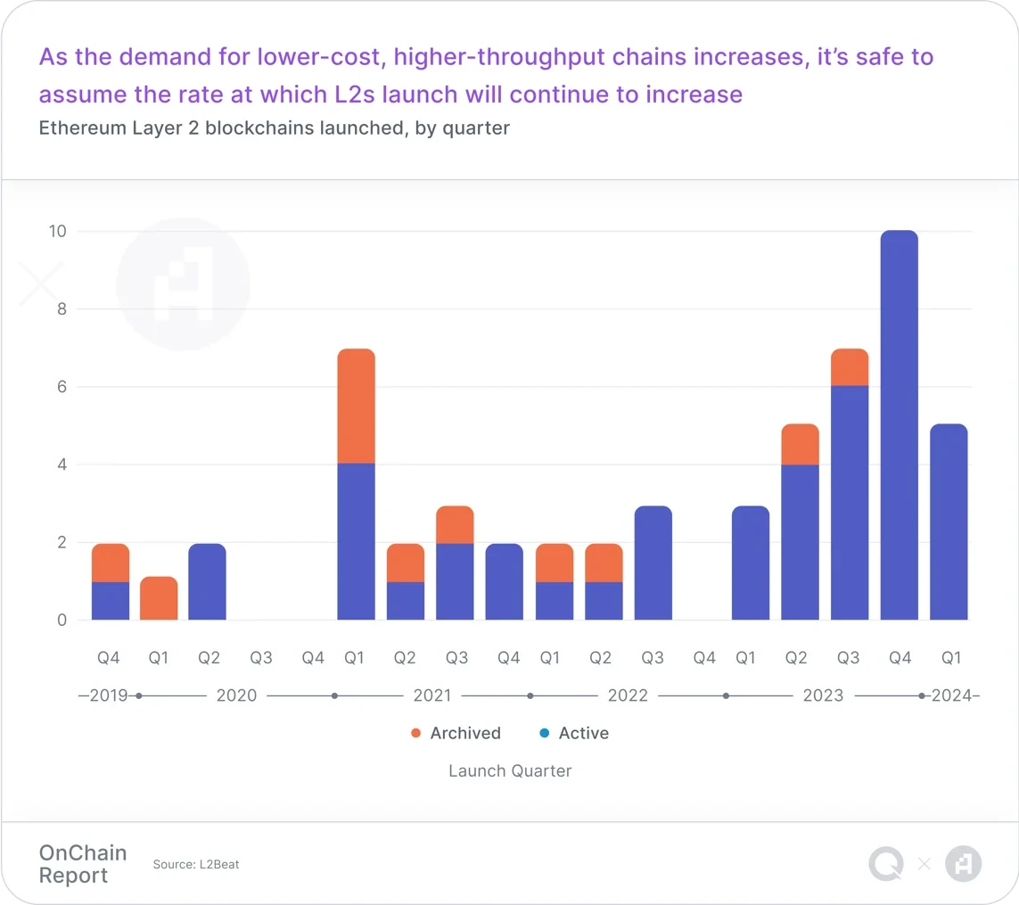 Layer 2 解决方案在 24 年第一季度显著提高了区块链的可扩展性,具有更快的交易速度和更低的成本,有助于解决主要网络上的拥堵和高交易费用等关键挑战。 Layer 2 市场不断扩大,每个季度都有新的链推出。