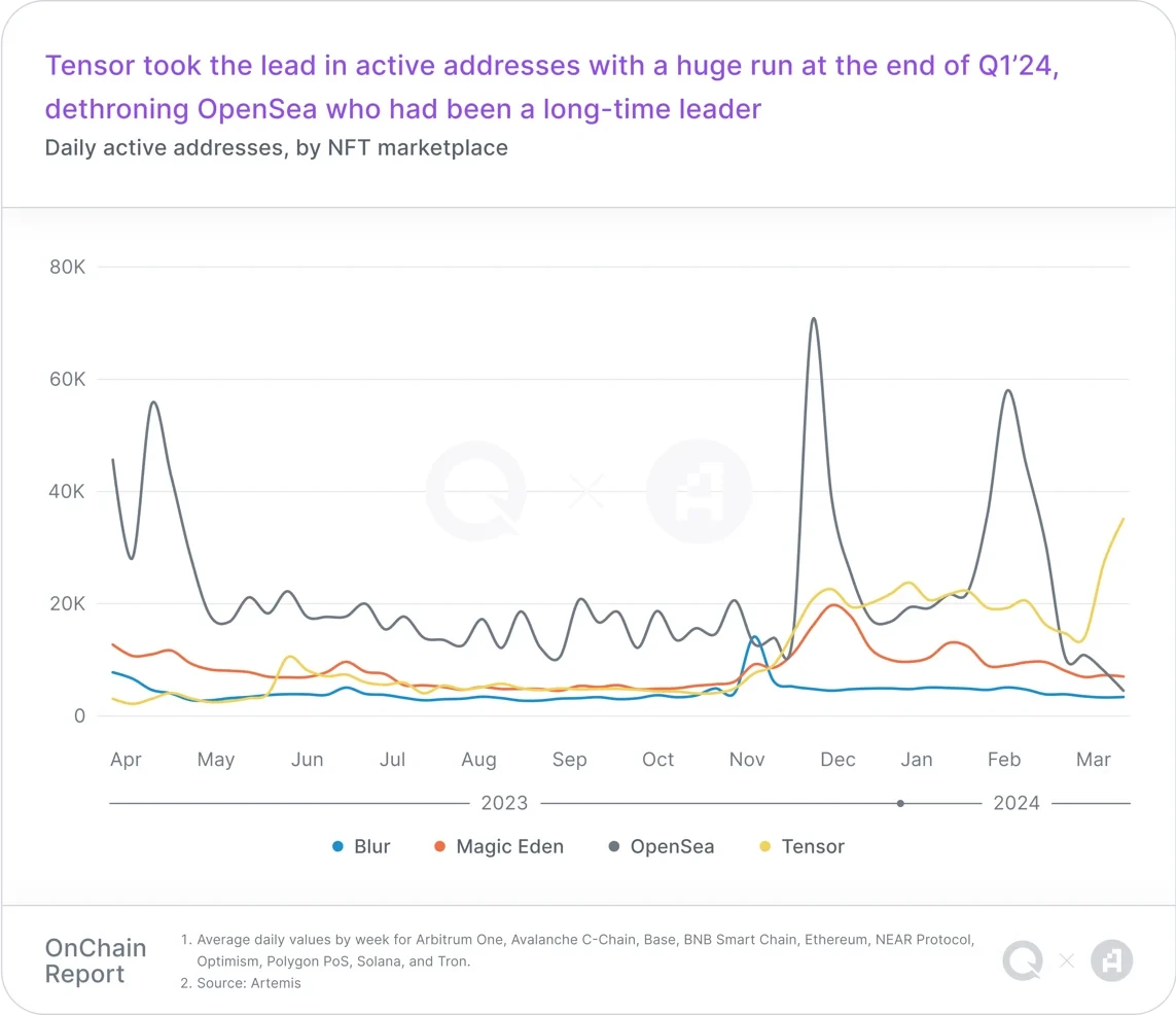 2023 年,以太坊在 NFT 市场交易量方面远超其它链,但在 24 年第一季度,Solana NFT 市场的交易量和活动量猛增。虽然 OpenSea 和 Magic Eden 在历史上分别占据着每日 NFT 活跃地址和 NFT 交易数量的主导地位,但这一趋势在 24 年第一季度被 Tensor 超越,表明用户偏好和平台性能发生了变化。