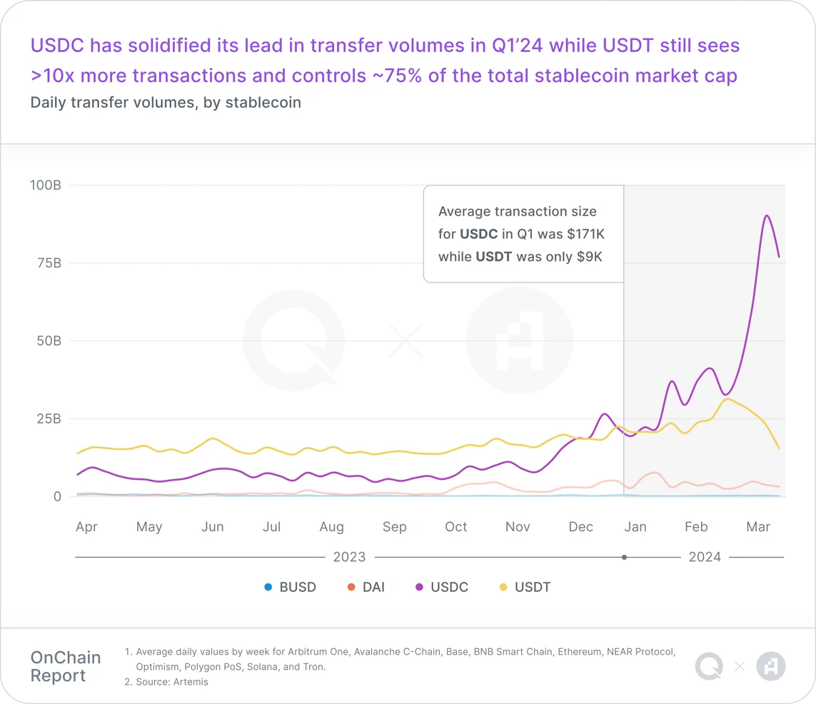 尽管 USDT 在 24 年第一季度处理的交易数量是 USDC 的 10 倍以上,但 USDC 在交易量和平均交易规模方面处于领先地位。