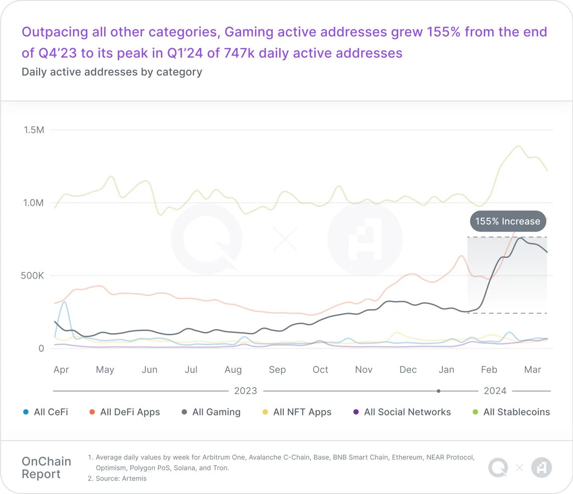 Web3游戏赛道经历了显著的增长,在交易量上超过了稳定币,并成为同比增长最快的Web3类别。与 23 年第四季度相比,Web3游戏在 24 年第一季度的日活跃地址增长了 155% ,达到了 74.7 万的峰值。Web3游戏赛道的交易数量同比增长了 370% 。