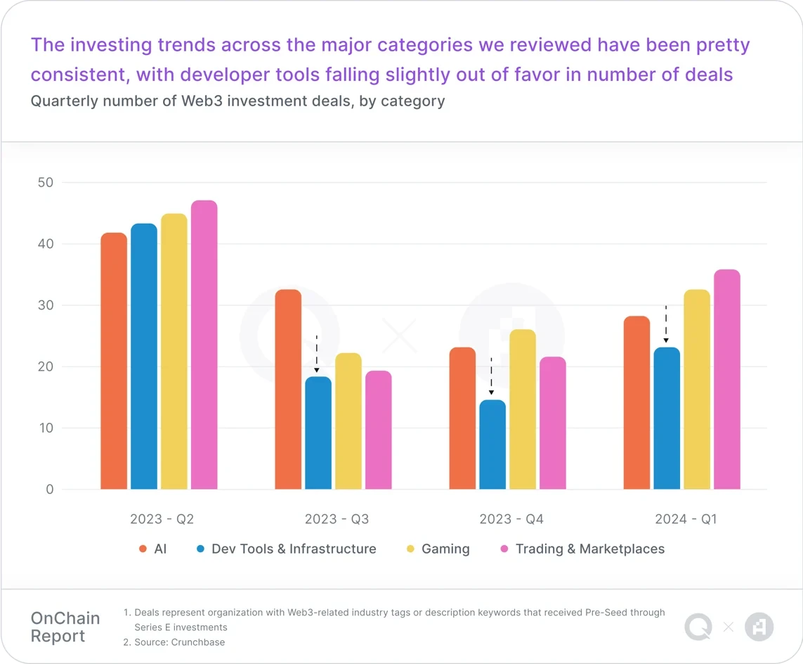 相比之下,开发商工具和交易等领域的融资和数量仅略有增加,表明投资者的态度较为谨慎,可能是由于这些领域的不确定性或短期回报较低。