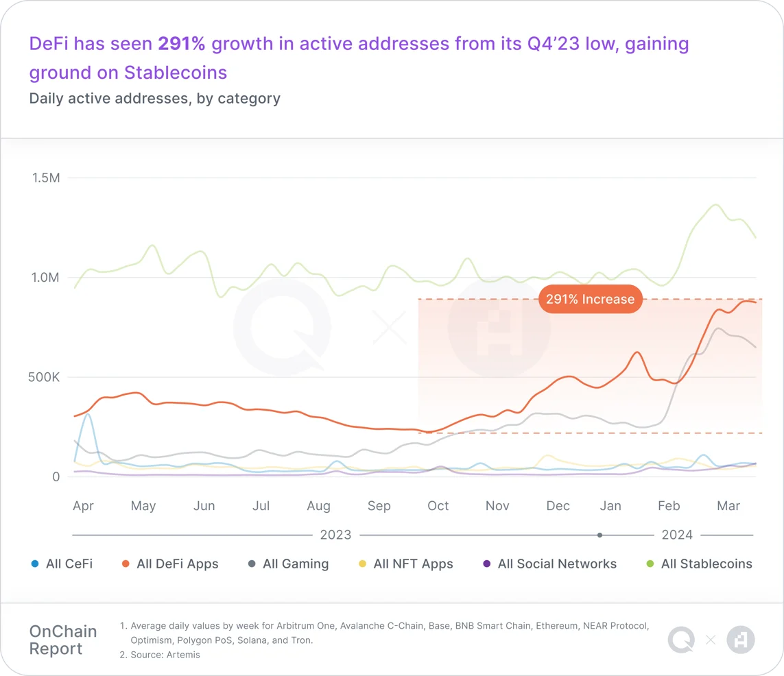 DeFi 在第一季度日活地址数环比增长 291% 。这一增长代表了资本流入的复苏和新的收益生成协议的出现,这些协议促进了用户活动的增长。
