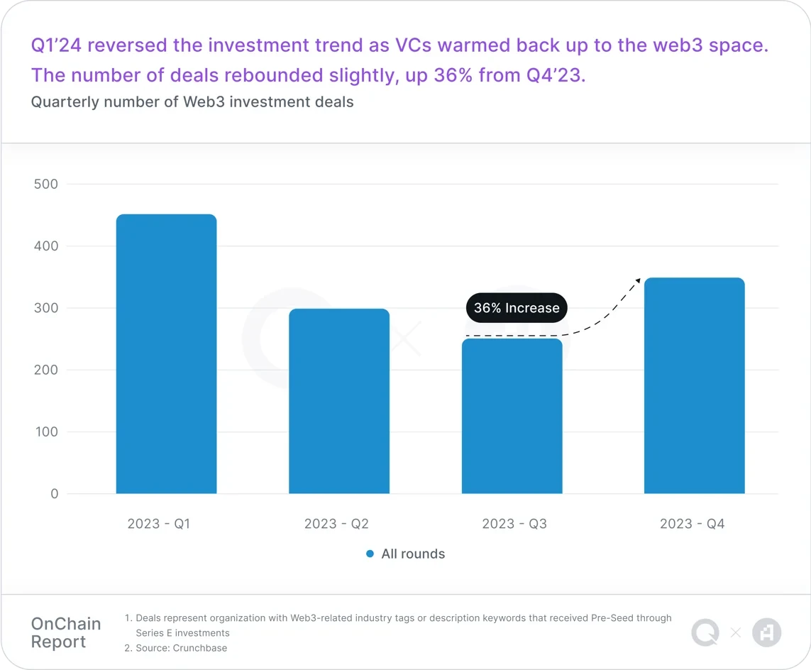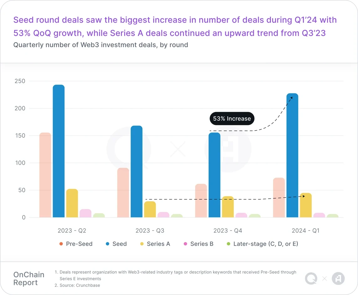 除了融资数量环比增长 36% 外,Web3的总融资额比 23 年第四季度增长了 55% 。种子轮融资数量增长最显著,环比增长 53% 。A 轮和种子轮的融资额显著增加,几乎是上一季度的两倍。在融资类别中,AI 领域最受欢迎,显示出市场对探索 AI 如何成为Web3的关键价值驱动产生浓厚兴趣。