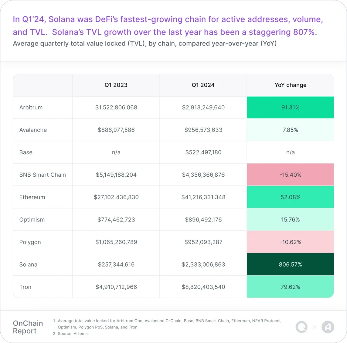 DeFi 在 24 年第一季度真正进入了一个新的时代,开发者和用户活动的大幅增加,特别是 Solana 和 Base 网络。质押、流动性质押、再质押和流动性再质押都是 DeFi 最近爆炸性增长的催化剂,这也解释了为什么质押现在占 DeFi TVL 的很大一部分。