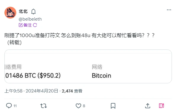 伴随着比特币减半,整个 BTC 网络都在参与各种符文项目,使得 Gas 高到离谱。由于超高的热度,很多小伙伴第一时间从交易所提币到 BTC 网络参与符文项目,虽然等待一段时间 BTC 顺利转到 BTC 网络,但到账金额与转账金额差距很大,甚至只是转账金额的零头,下图为第一时间从交易所提币到 BTC 网络的真实反馈。