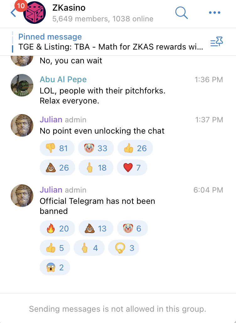 再加上 ZKasino 官方 Telegram 用户已被管理员禁言,且官方 X 自从 4 月 16 日后就再也没有更新,造成用户更大的不满与恐慌。
