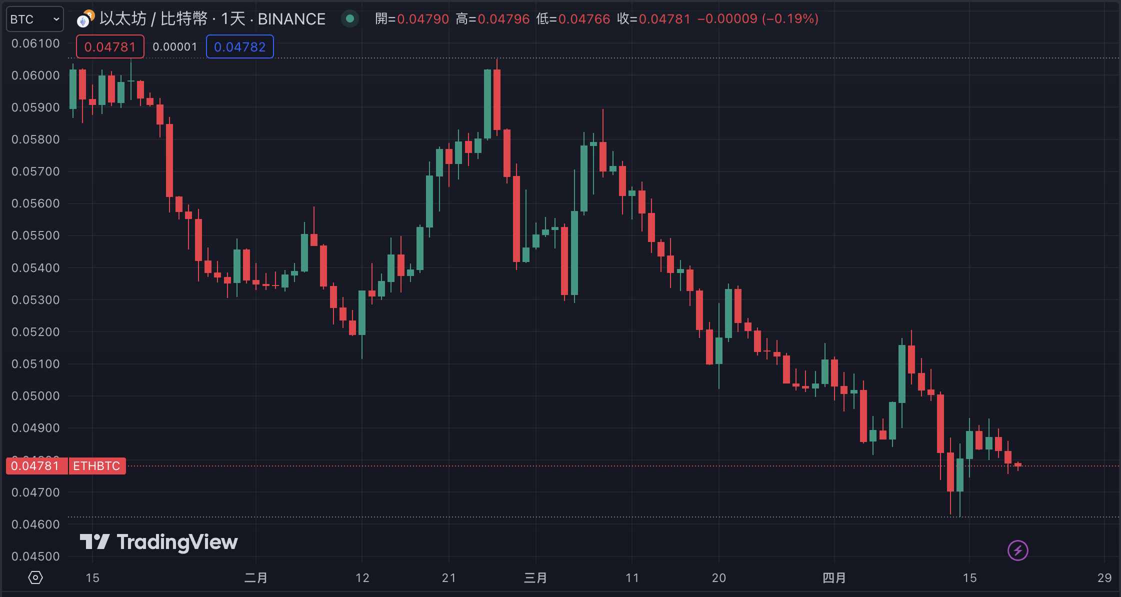 近期,以太坊不论是链上活动还是价格表现都相对比特币来的低迷。ETH/BTC 比率自 3 月 8 日以来就一路震盪下跌,当前已经跌破 0.048,现报 0.04781,创下自 2021 年 5 月以来的新低。