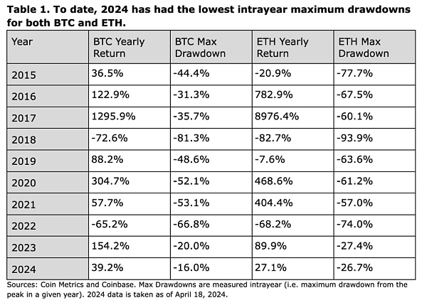 然而,这并不是说市场没有可能进一步走低。从最大回撤的角度来看, 2023 年是加密货币最好的一年,BTC 和 ETH 的峰值回撤分别为 20% 和 27.4% 。在此之前,BTC 最大回撤最小的年份是 2016 年,为 31.3% ,ETH 最大回撤最小的年份是 2021 年,为 57% (见表 1)。2024 年迄今为止的回撤幅度甚至小于 2023 年,而且考虑到年初至今实际波动率水平的升高,进一步下行的可能性是完全存在的。