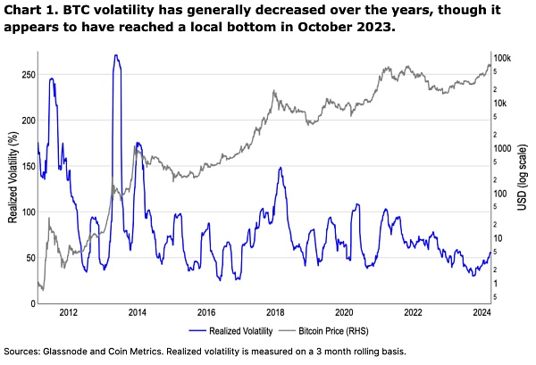 自 15 年前推出以来,该资产类别的波动率总体上一直在下降,尽管 2023 年 10 月达到了 3 个月实际波动率的局部底部(见图 1)。从那时起,随着波动性的增加,价格稳步向上逆转。我们认为,如果我们继续采取鹰派的避险环境,那些将比特币视为风险资产的人可能会继续抛售,直到他们与那些将比特币视为避险资产的群体达到平衡。