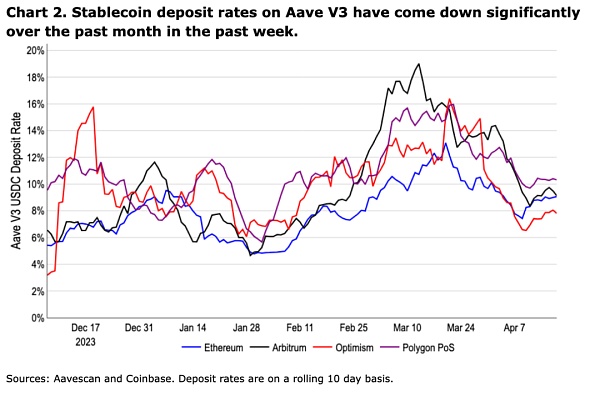 对链上的杠杆测量也反映了这一定位。Aave 上的稳定币存款利率已从 3 月份的峰值下降了 50% 以上,但仍高于今年 2024 年 1 月下旬的低点。我们认为,这表明交易者仍保留一些杠杆(因此从长远来看是建设性的),但已经在一定程度上降低了他们的头寸风险,以便应对短期的下行行情。