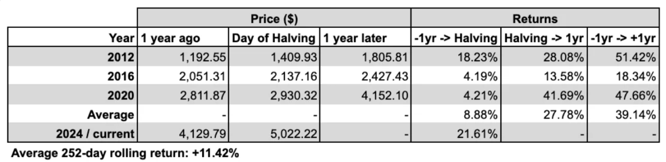 虽然 SPX 自 2011 年 7 月中旬以来的 1 年平均滚动回报率为 + 11.42% (与 BTC 历史价格数据相匹配),但其在比特币减半后开始算起的 1 年平均表现则超过 + 27% ——即平均值的两倍多!