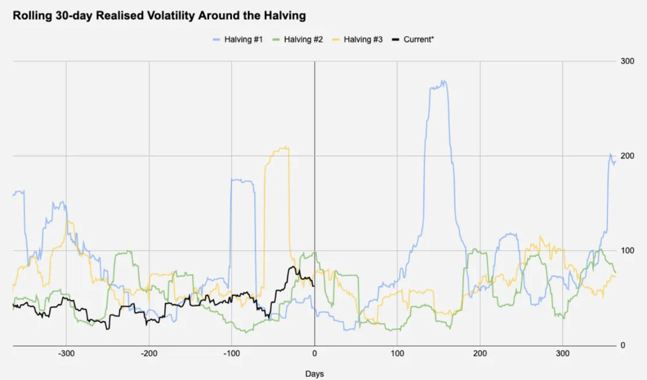 同时,对于那些对波动性感兴趣的人来说,数据显示波动性似乎与减半日期或周期没有明显的关系,下图就显示了减半日期(+-365 天)前后的 30 天实际波动率: