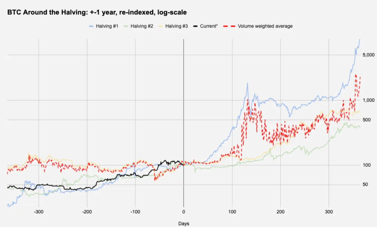 上图就显示了 BTC 在每一个减半日之前和之后的历史价格走势(范围是从减半前 1 年到后 1 年),红色虚线显示过去每次减半的成交量加权平均值,而黑线显示当前的 BTC 数据情况。