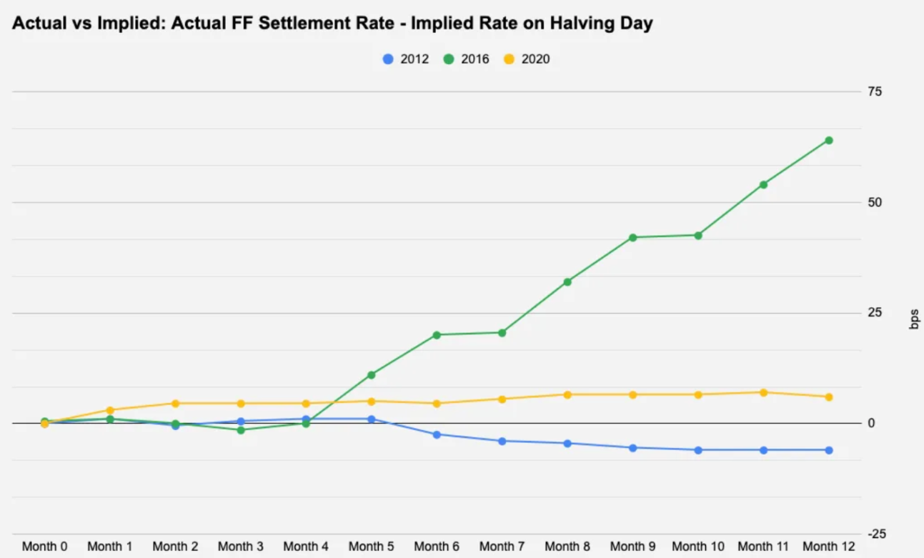降息通常对风险资产有利,但对价格走势来说,重要的往往不是已经定价进去的因素,而是与市场预期的偏差程度——无论是通胀数据还是美联储主席的声明。在下图,我们比较了每个减半日实际结算隐含利率与市场预期之间的差异,以查看上图中的前瞻性定价的准确性。