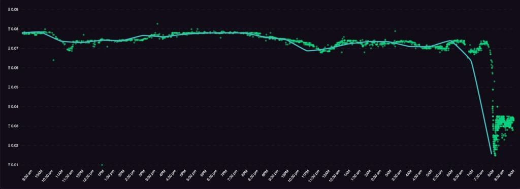不过就在快照宣布完成,Runestone 一个利好落地后,其地板价立刻迎来大量卖压,地板价从 0.73 BTC 大幅跳水到 0.0305 BTC,一小时内跌幅超 50%,波动非常剧烈。