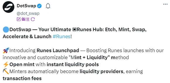 概念:比特币生态交易平台 @dot_swap 的首个 Runes Launchpad,平台宣布将推出符文的 AMM 功能。
