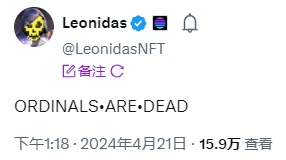 概念:Ordinals 在 23 年 5 月爆火之后,于三季度沉寂,当时出现了 Ordinals 已死(Ordinals are dead)的说法,符石创始人@LeonidasNFT 再次发文涉及该口号时,该符文热度开始飙升并快速铸造完毕。