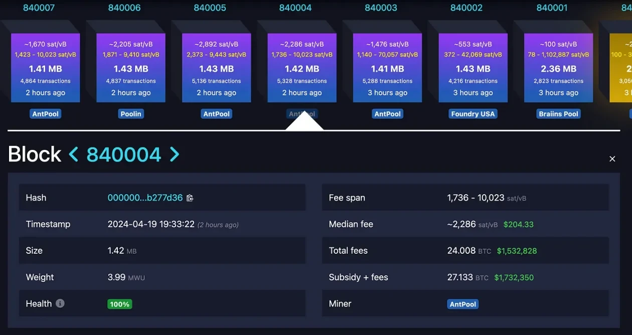 不仅第 840, 000 个区块的手续费很高,接下来的 5 个区块的手续费也很高:分别为 4.486、 6.99、 16.068、 24.008 和 29.821 BTC,这创造了历史记录,比特币网络从未发生过类似的情况。
