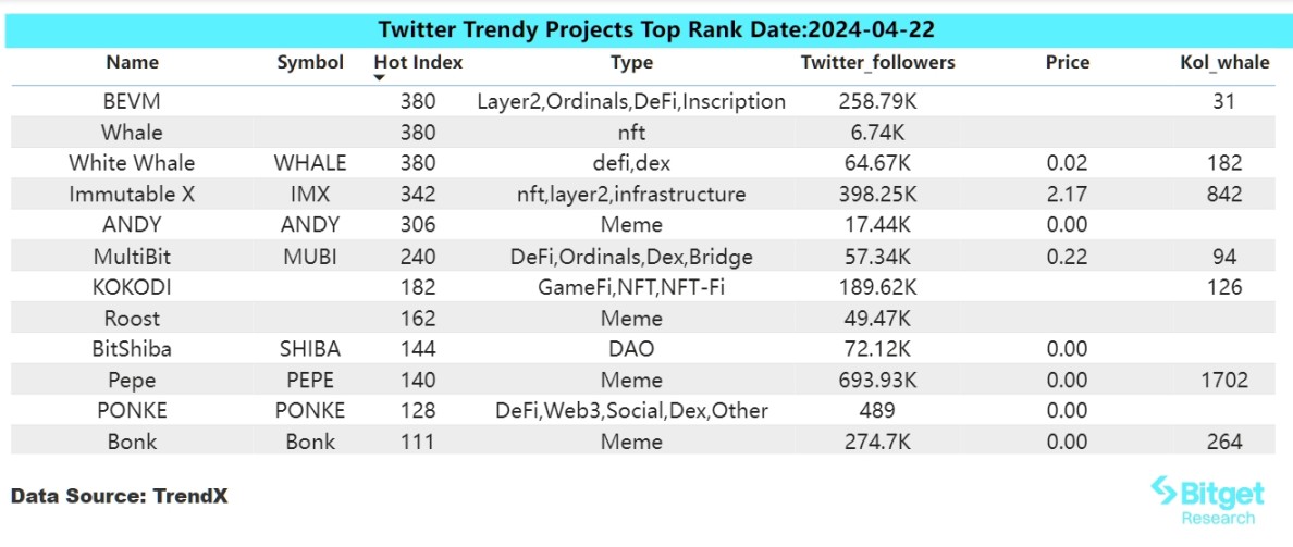 主要原因: 市场反弹,Meme 板块尤其是 Solana Meme 大力反弹上涨。4 月 20 日,BONK DAO 提议销毁超过 2780 亿枚 BONK 代币,这相当于 BONK DAO 自 2023 年底推出以来与 BonkBot 的收入分成协议获得的全部 BONK 代币。BONK 当日大涨,Solana meme 板块中头部 meme、中长尾 meme 齐涨。