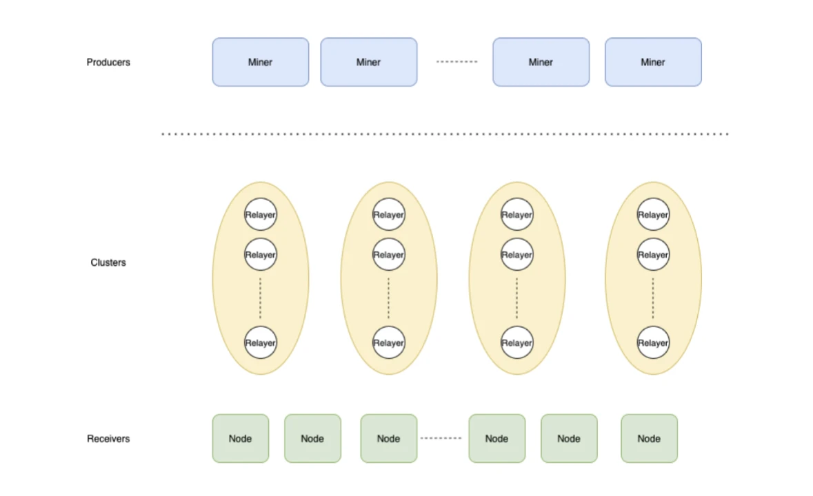 集群:集群是中继器的集合,它们共同负责将区块从生产者传播到所有接收者,集群相互竞争,以最快的速度将消息传递给接收者。集群预计将分布在互联网上,以便有效地传播到接收器;