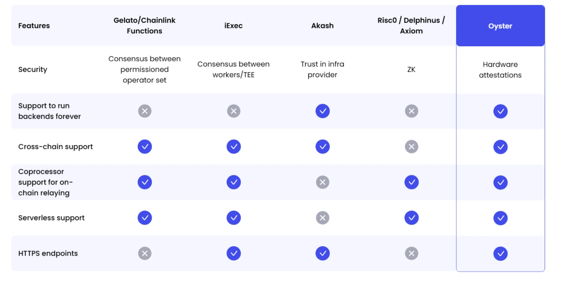 在此基础上,Oyster 彻底改变了去中心化服务(如 API 和网关)的管理形式,推动其从传统的基础设施管理转变为基于智能合约的自主运营,正因如此,与其他 DePIN 平台相比,Oyster 是一种更出色的计算平台——在第三方节点上执行时具有代码验证的优势。