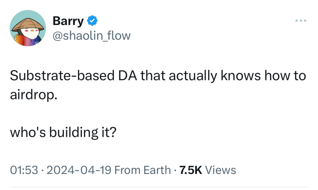 Dymension 的创始人似乎也对此不太满意。他在 Avail 空投宣布细则后发推写到:真正知道该如何空投的基于 Substrate 的 DA,谁在构建?