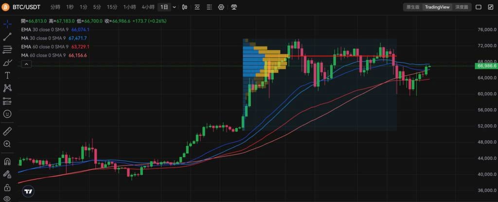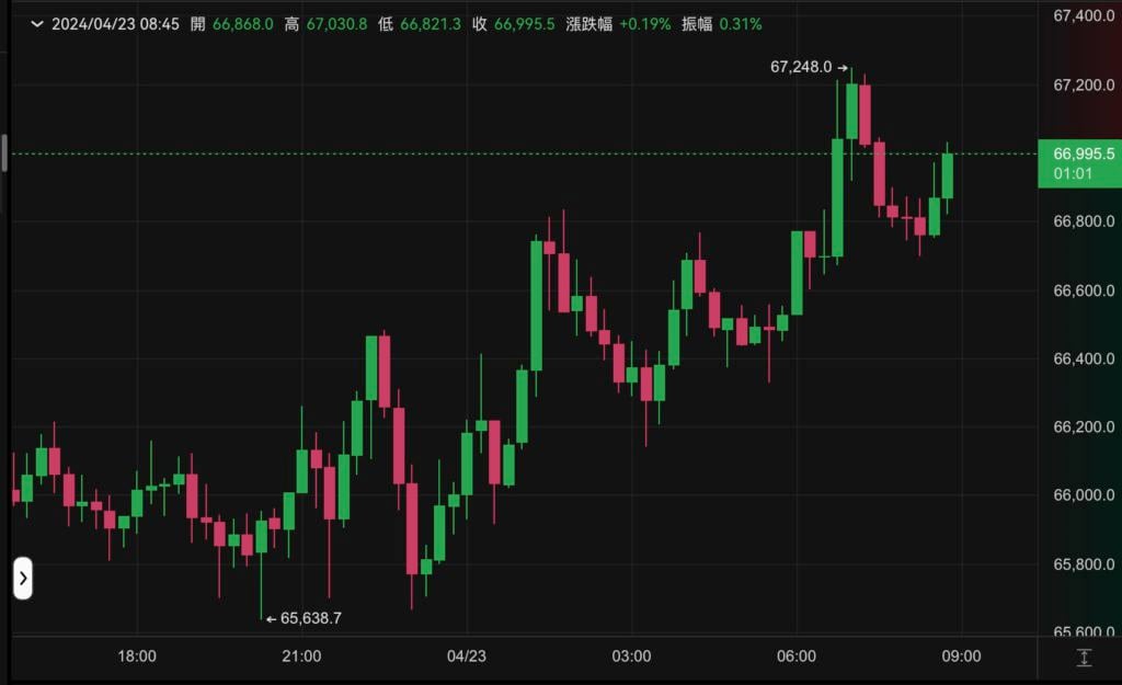 比 特币在完成第四次减半后的首周,价格走势表现得不错,昨日突破 6.5 万美元之后就持续震盪走高,稍早七点多最高触及 67,248 美元,近 24 小时上涨 3.34 %。